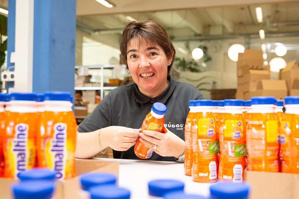 «Ich weiss, was ich hier zu tun habe. Die Arbeitsschritte sind klar beschrieben und ich kann selbständig wirken. Ich muss nicht warten, bis mir jemand Anweisungen gibt. Das Zusammenstellen der Ovomaltine-Muster ist für mich eine ideale Arbeit. Auch wenn es grosse Mengen sind, wird es nicht eintönig. Wir kommen gut voran, und ich freue mich auf die weiteren Aufträge – ich hoffe, es bleibt so.