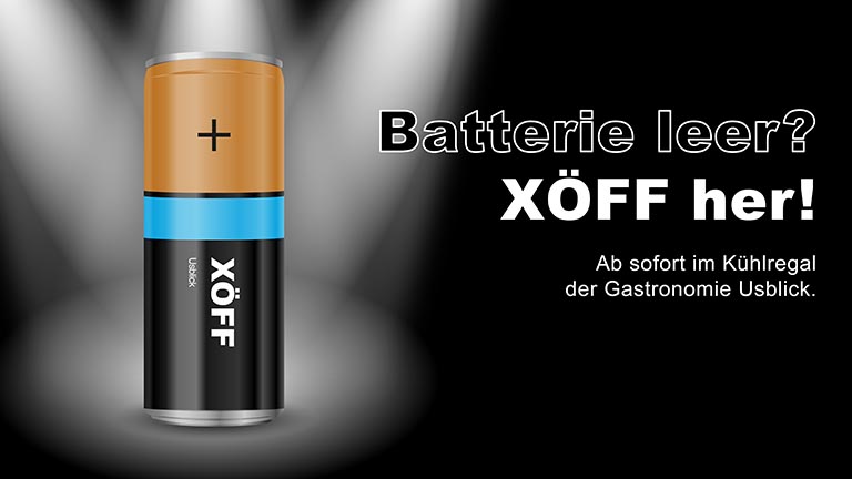 Energydrinks, hergestellt von einem Romanshorner Unternehmen, waren im Usblick-Regal schon immer präsent. Irgendwann entstand in der Unternehmenskommunikation die Idee, diesen neutralen Dosen ein eigenes Kleid zu geben. Das war die Geburtsstunde von Xöff. Im Wissen um den süssen Inhalt verpasste die Unternehmenskommunikation dem Drink diesen selbstironischen Namen. In die Gestaltung der ersten Serien waren lernende Typografen involviert: Es entstanden Editionen wie Grufti, Röntgen, 1001 und andere. Im Regal blieb anschliessend die Batterie- Version als Standard-Design, bis vor wenigen Jahren eine Auffrischung angesagt war: Dance, Bling Bling und zwei weitere Designs wurden mit lernenden Grafikern entwickelt. Nachdem diese Motive vergriffen waren, kam die Batterie zurück ins Regal.