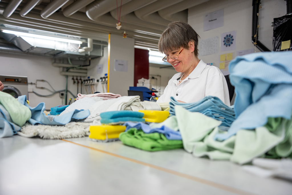 Als Teamleiterin Hauswirtschaft unterstützt und begleitet Carolin Bär ihre Mitarbeitenden im Arbeitsalltag und in der Ausbildung. Ausserdem koordiniert und organisiert sie die Arbeit in der Wäscherei. Dort beginnt der Tag bereits um 7:50 Uhr. Als erstes wird im Team die anfallende Arbeit für den Tag besprochen. Dann werden die Mitarbeiterinnen ihren Möglichkeiten entsprechend in ihre Arbeitsbereiche eingeteilt. Anschliessend wird die Schmutzwäsche von der Küche, der Gärtnerei und dem technischen Dienst sowie vom Campus abgeholt. So kommen an manchen Tagen bis zu 300 Kilogramm Wäsche in der Wäscherei zusammen. Das sind vier Tonnen pro Monat. Dieser Wäscheberg wird zuerst sortiert und gewaschen, um dann getrocknet und gebügelt zu werden. Anschliessend wird die Wäsche für die verschiedenen internen Abteilungen wieder zur Verfügung gestellt. Diese Arbeitsschritte wiederholen sich bis zu viermal täglich.